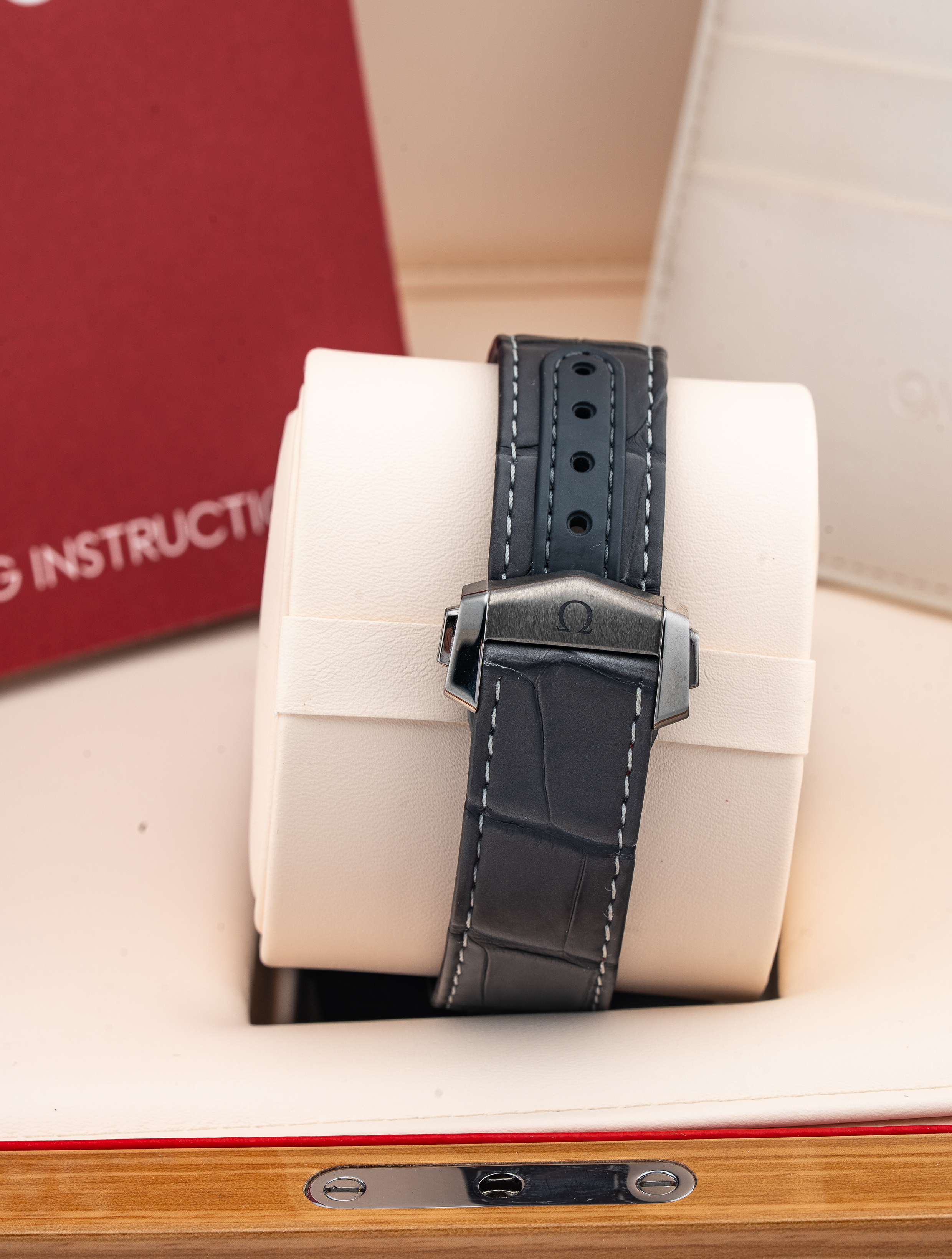 Strap/Buckle: original Omega Darkside Grey alligator strap (anthracite stitching on top/red stitching on underside) with original Omega ceramic folding deployant buckle. Strap and buckle are in brand new condition and show no signs of wear.