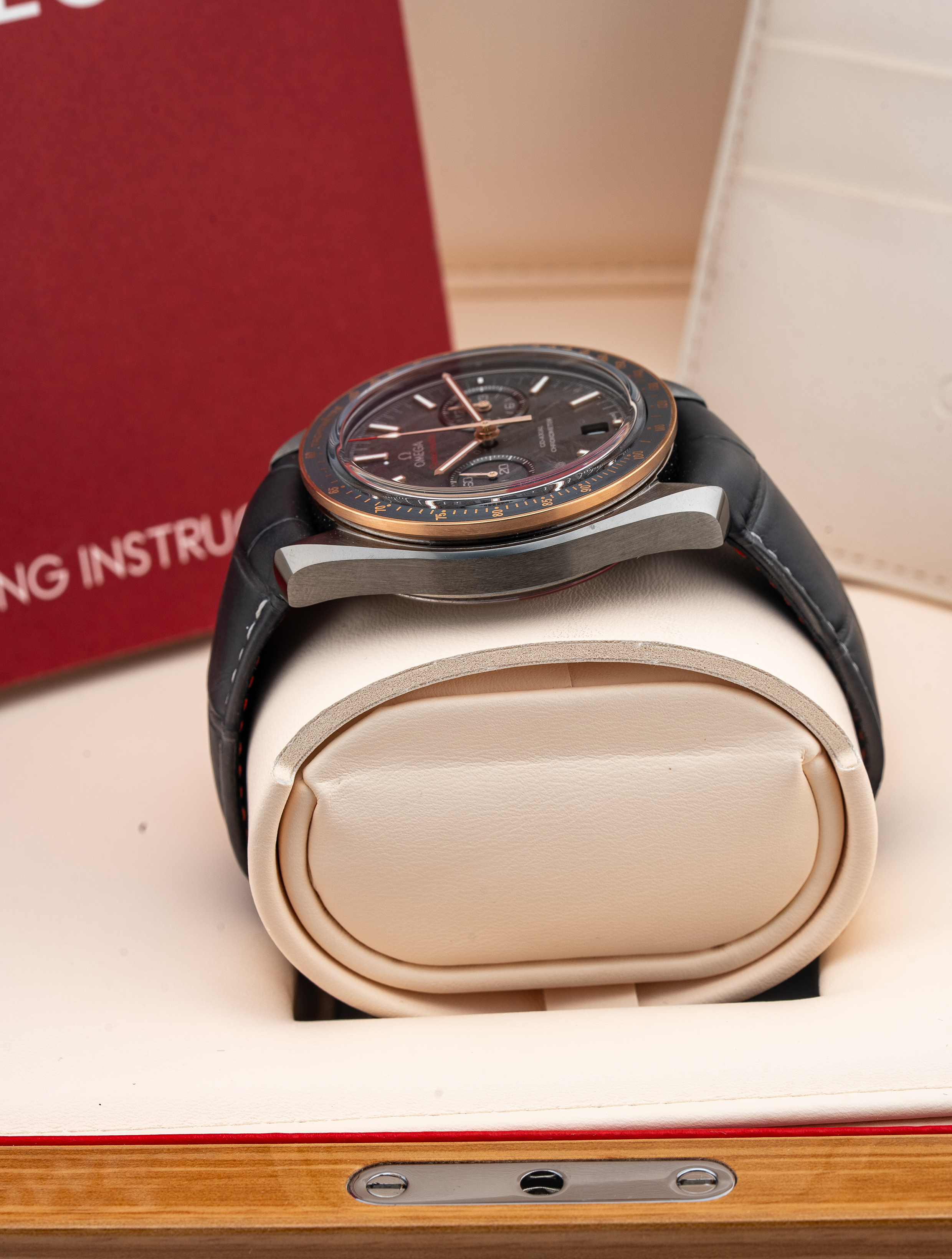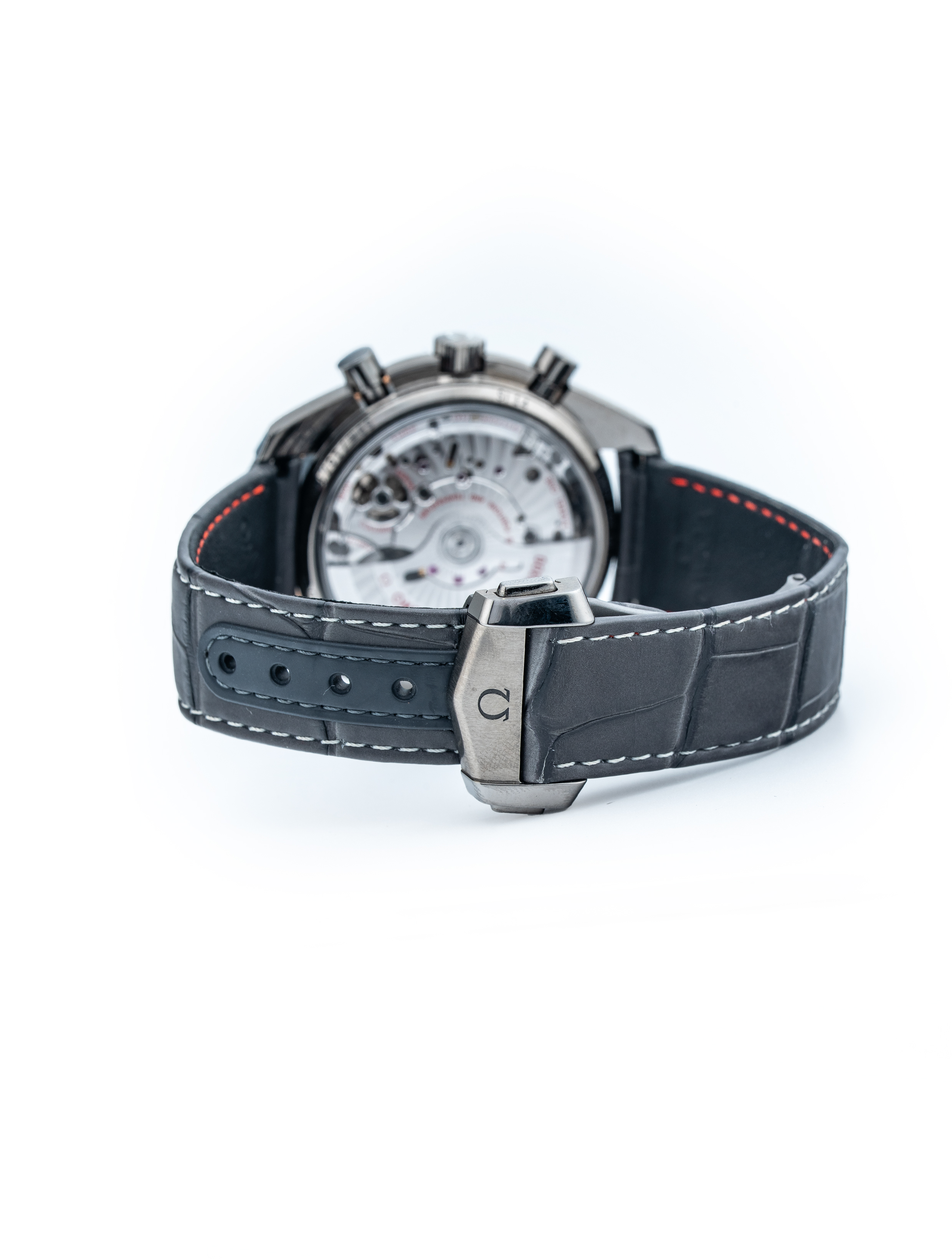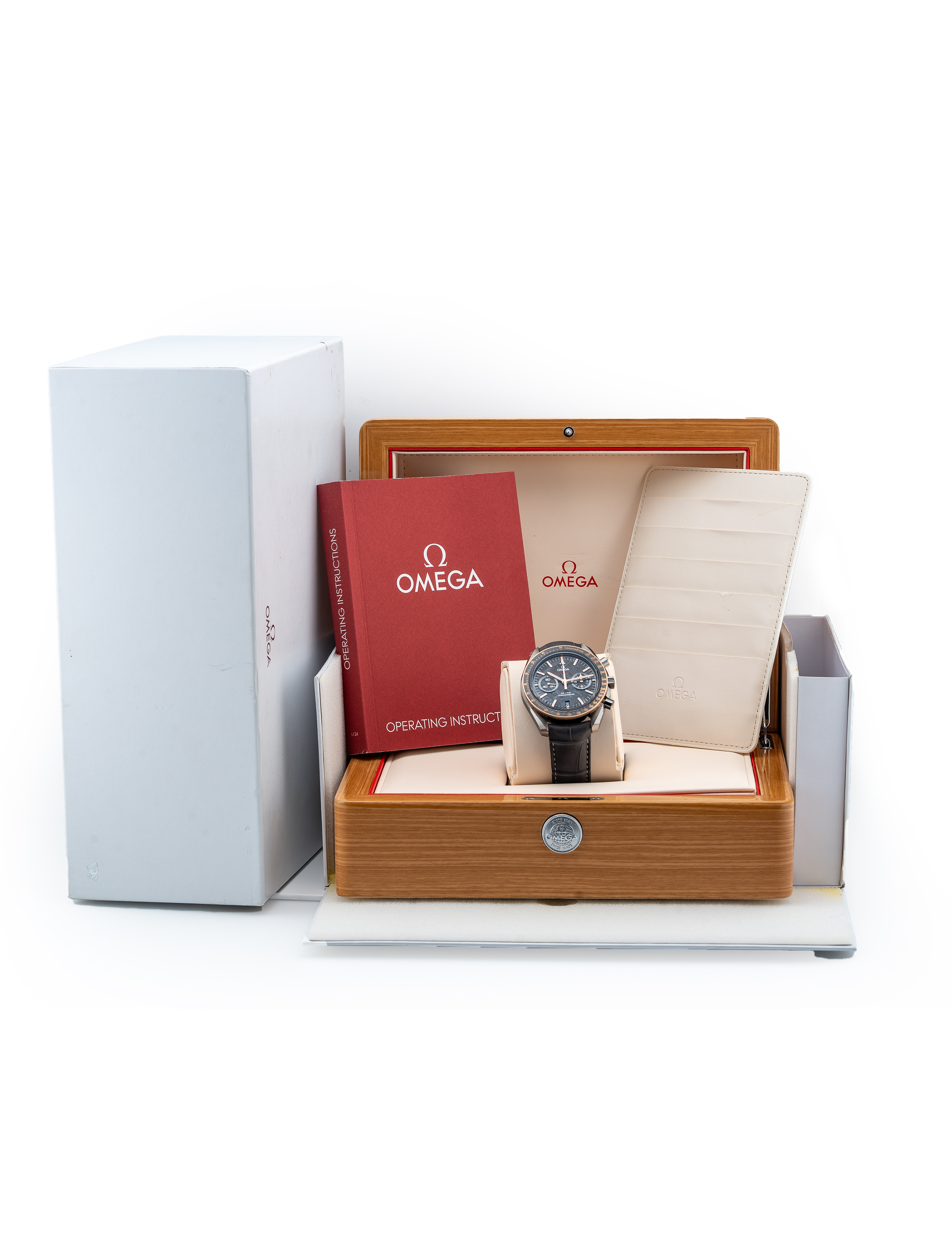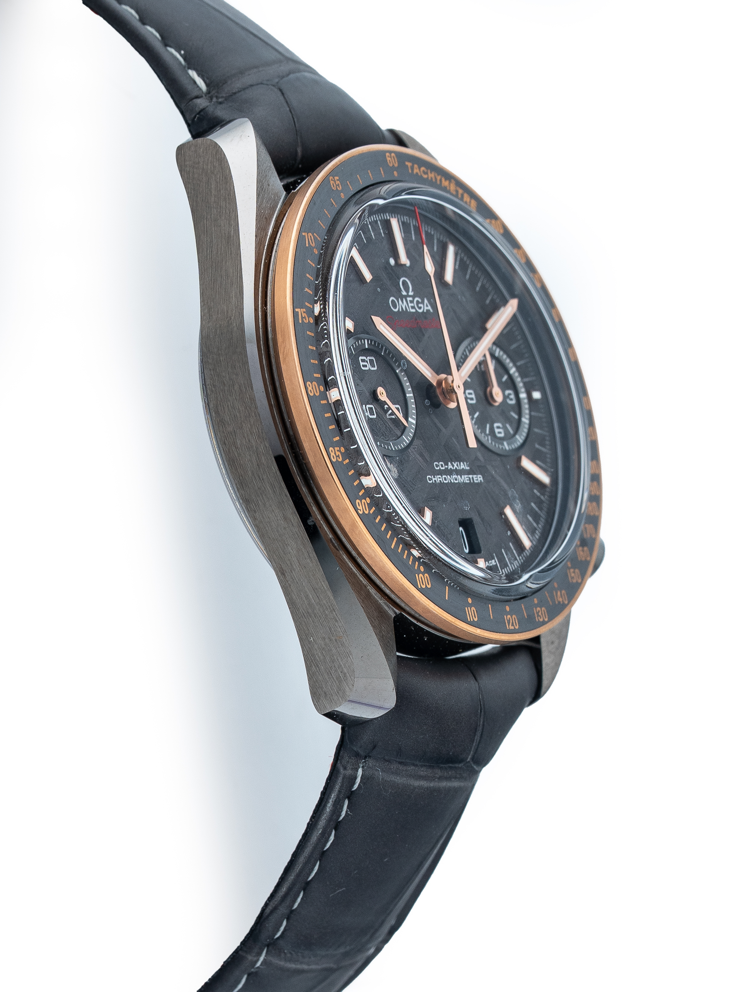 44mm Grey ceramic case complemented by 18K Sedna™ gold Moonwatch-style hands and an 18K Sedna™ gold bezel with a silicon nitride ring and brushed OMEGA Ceragold™ tachymeter scale.