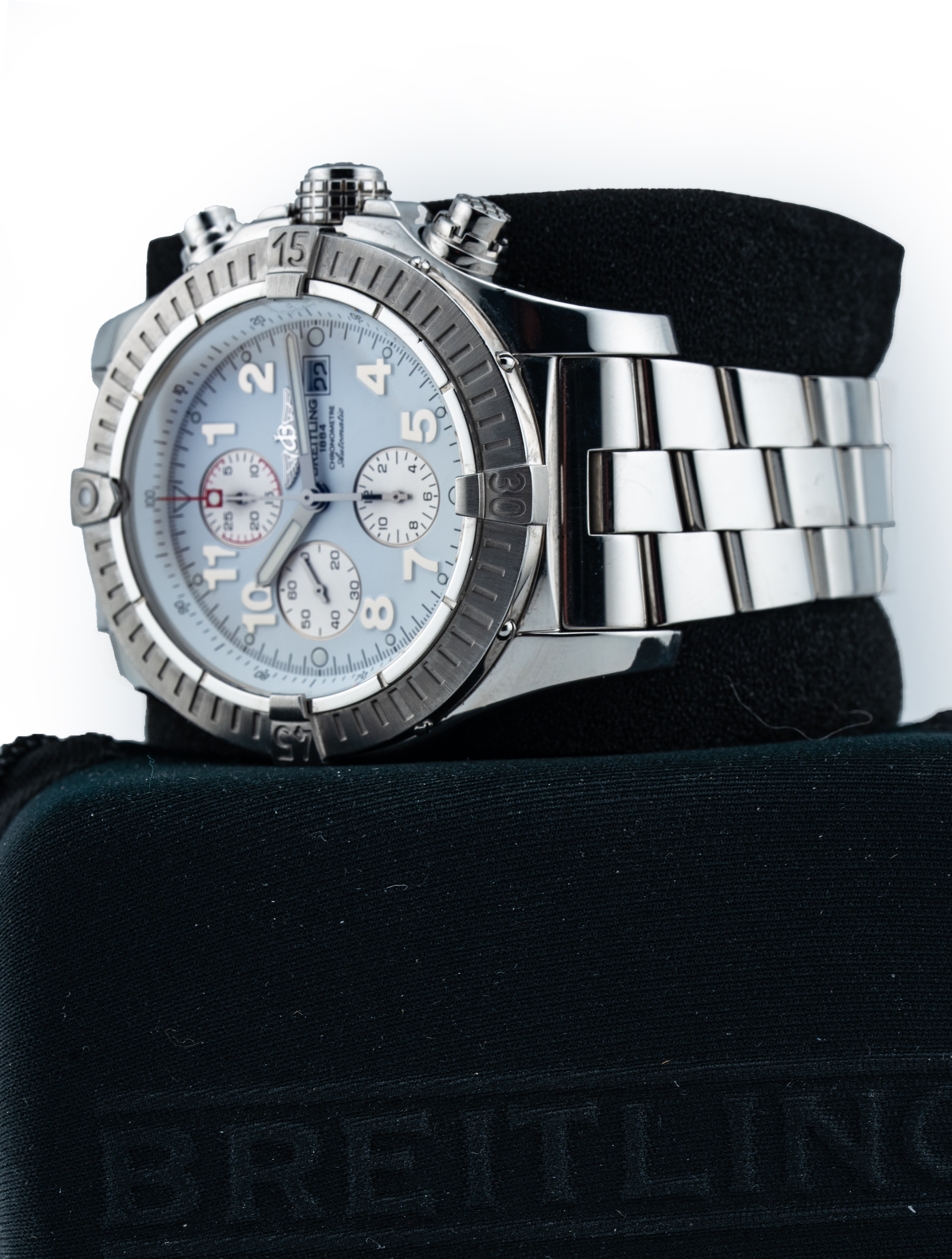 This pre-owned Breitling Super Avenger ref. A1337011/A562 (2008) is a bold and striking timepiece, featuring a white Arabic dial that offers exceptional readability. The 48mm stainless steel case exudes rugged elegance, while the self-winding chronograph movement ensures precise timing. With 200m water resistance, a rotating bezel, and a durable stainless steel bracelet, this Super Avenger is built to perform under the toughest conditions. A true standout for those who appreciate both form and function in a luxury watch.